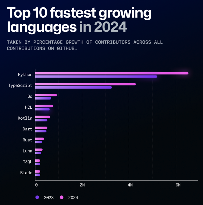 报告称:“一些非英语人口大国的崛起值得关注,因为与此同时,生成式人工智能工具也在不断涌现,这些工具越来越多地使开发人员能够用自然语言编写代码。”