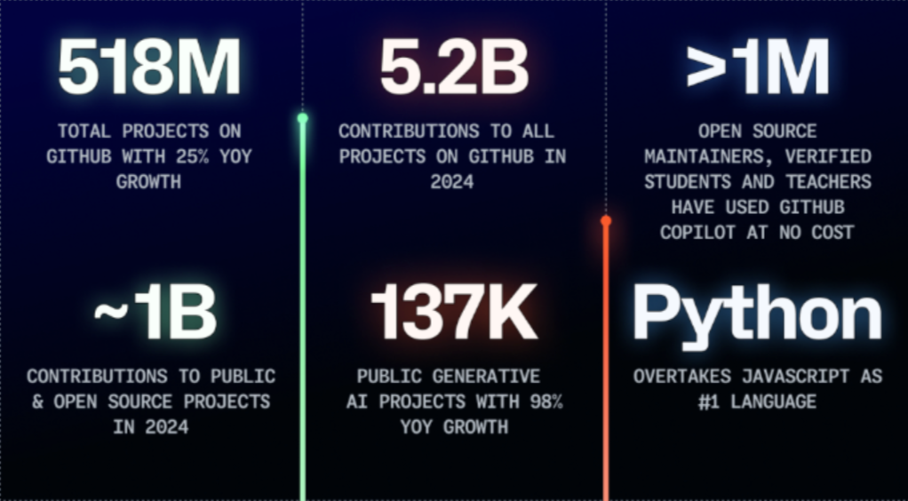 截至目前,GitHub 上有 5.18 亿个项目,同比增长 25%,2024 年期间的项目贡献量达 52 亿次。